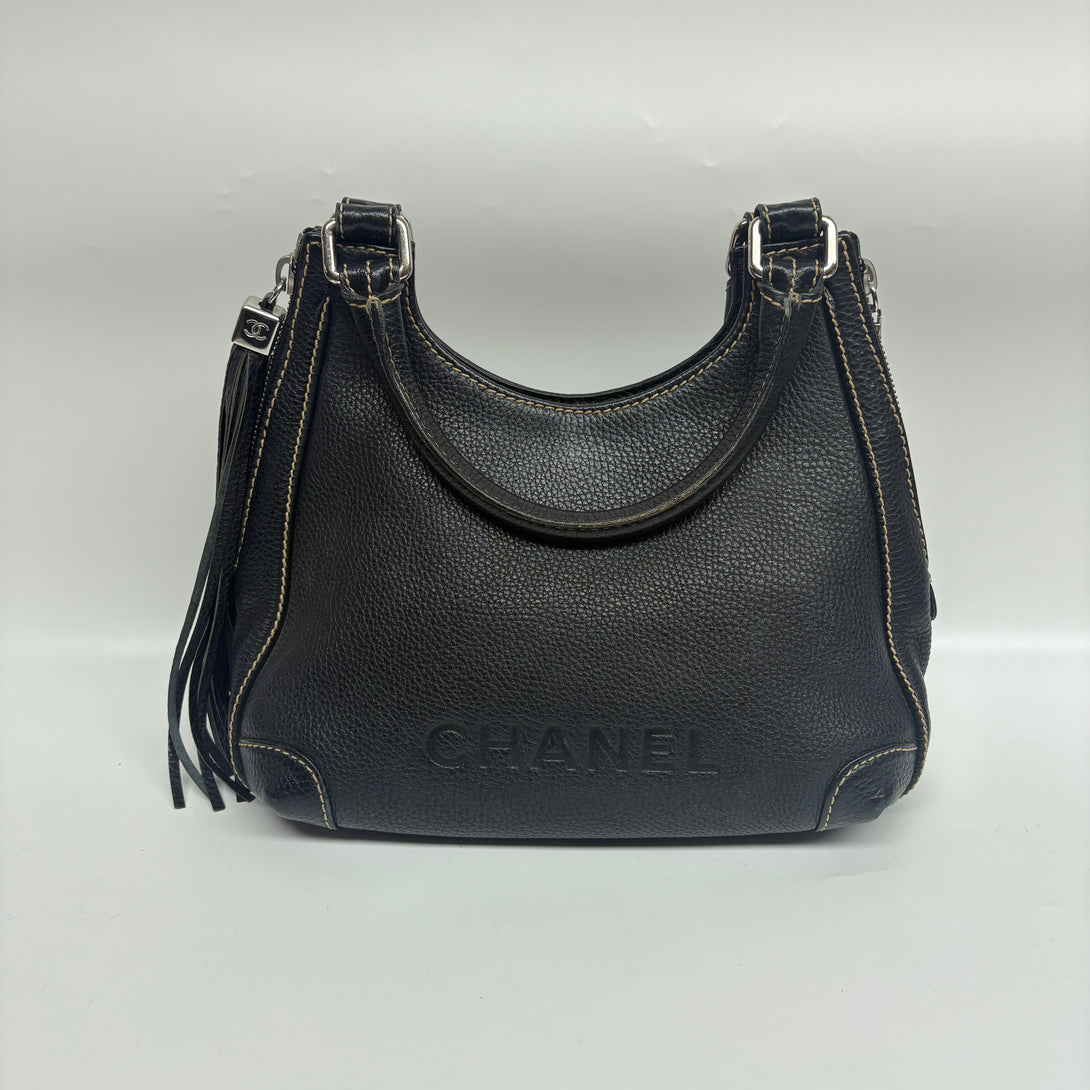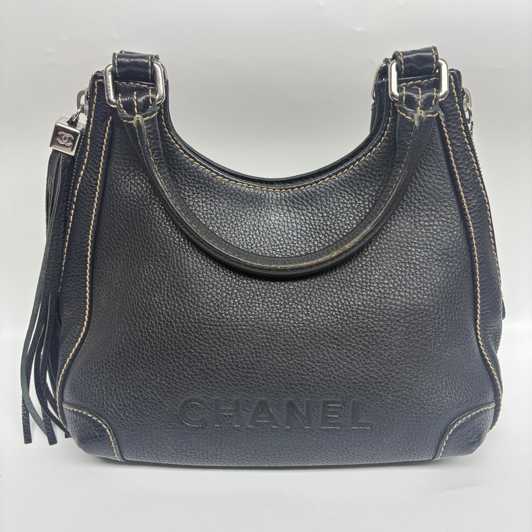 This pre-owned Chanel underarm bag is crafted from black grainy textured calfskin, offering both durability and a refined aesthetic. Its sleek silhouette and subtle texture make it a versatile accessory for both day and evening wear. Designed to comfortably fit under the arm, it combines classic Chanel elegance with practical functionality, perfect for those seeking timeless sophistication with everyday usability.