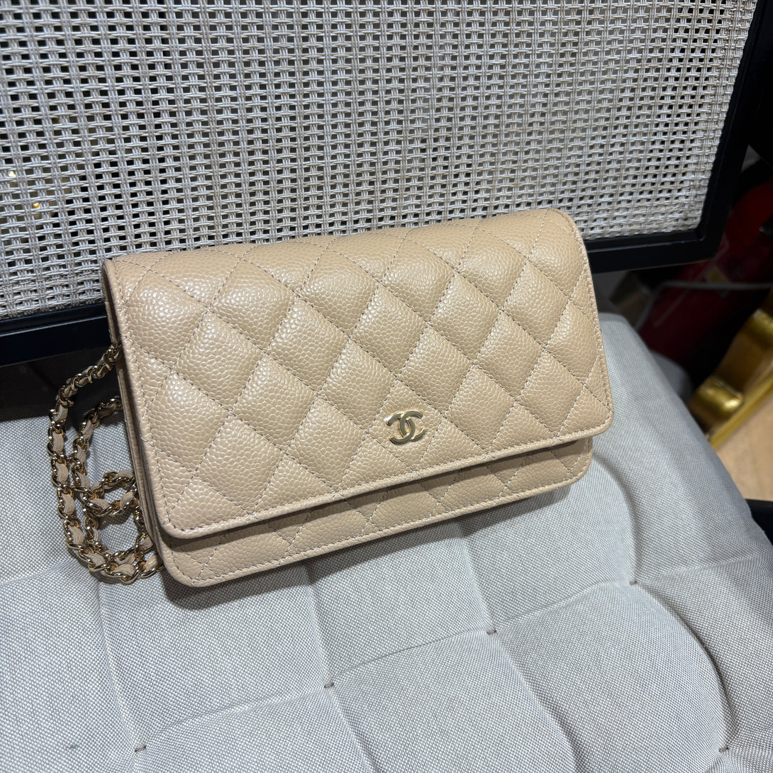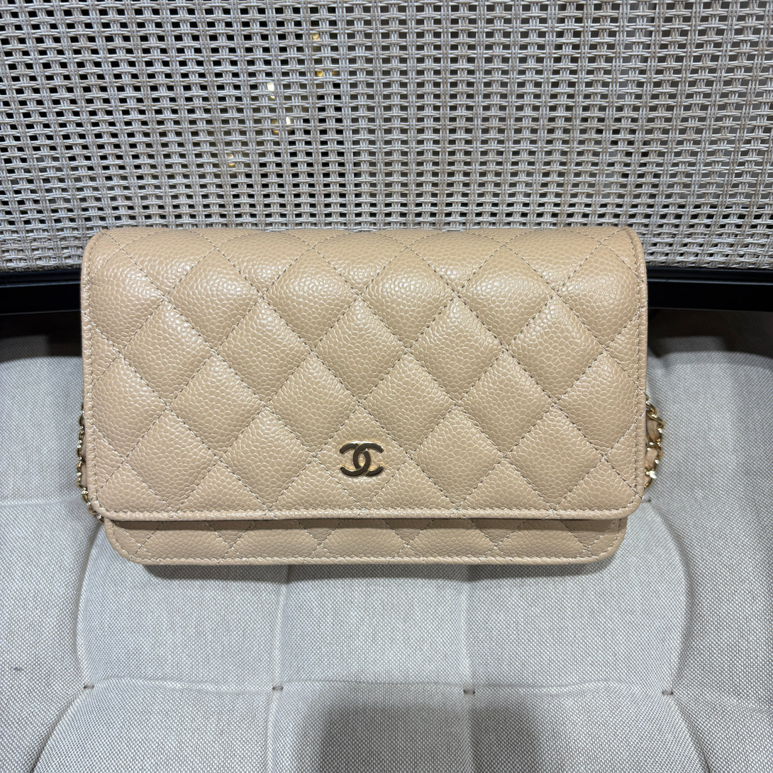 Elevate your collection with this pre-owned Chanel Classic Flap in beige caviar leather. This iconic crossbody features the signature quilted design and interlocking CC hardware that defines luxury craftsmanship. The supple caviar texture resists daily wear while maintaining its refined appearance. Versatile enough for both casual and formal occasions, this timeless piece transitions seamlessly from day to evening. A sophisticated investment in enduring style.