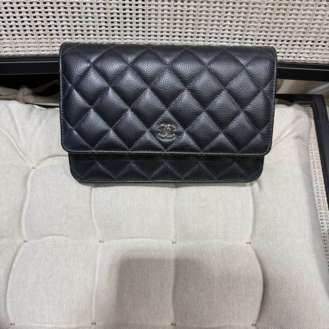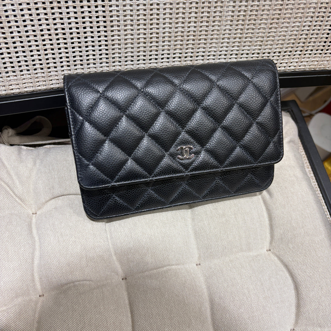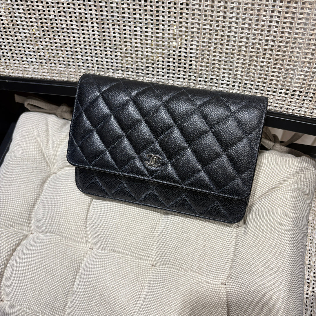 Elevate your collection with this pre-owned Chanel Classic Flap WOC in black caviar leather. This iconic wallet-on-chain combines timeless elegance with practical versatility, featuring the signature quilted design and interlocking CC hardware. The supple caviar leather develops a beautiful patina over time, adding character to this coveted piece. Perfect for those who appreciate authentic luxury and sustainable fashion, this crossbody offers the prestige of Chanel with the practicality of a compact silhouette. An investment piece that transcends seasonal trends.