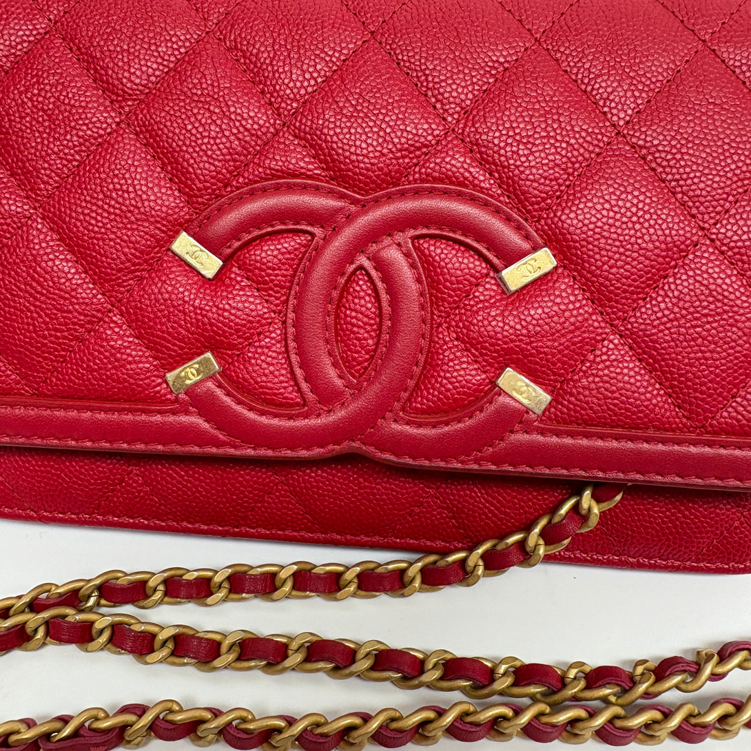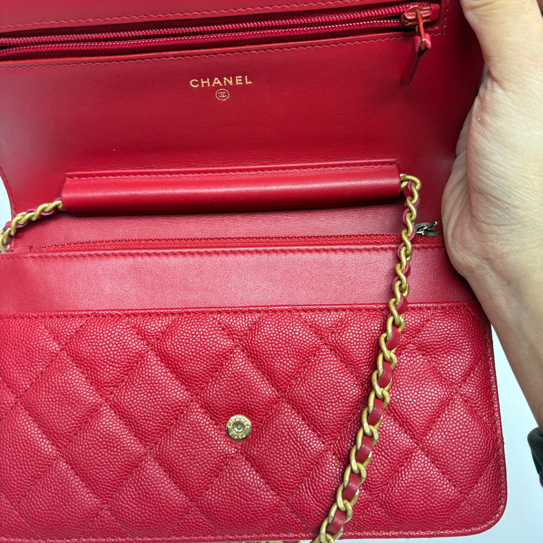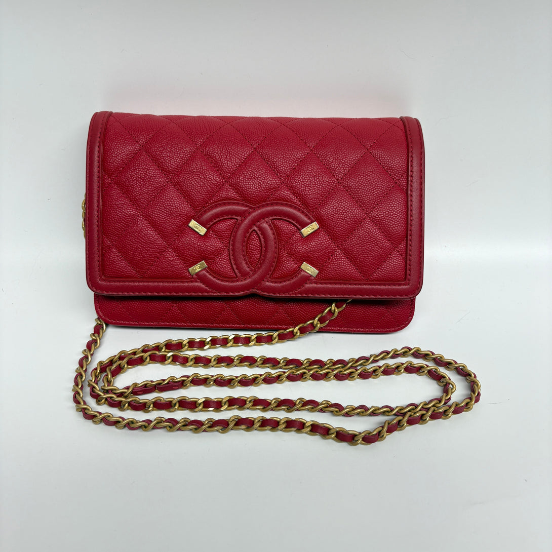 This pre-owned Chanel Red Calfskin Caviar Wallet on Chain (WOC) combines timeless elegance with practical design. Crafted from durable, textured calfskin caviar leather, it offers resistance to scratches and wear while maintaining a vibrant red hue. Its compact silhouette is perfect for carrying essentials, with a secure chain strap adding versatile styling options for both day and evening occasions. A sophisticated choice for those who appreciate luxury accessories with lasting quality and refined craftsmanship.