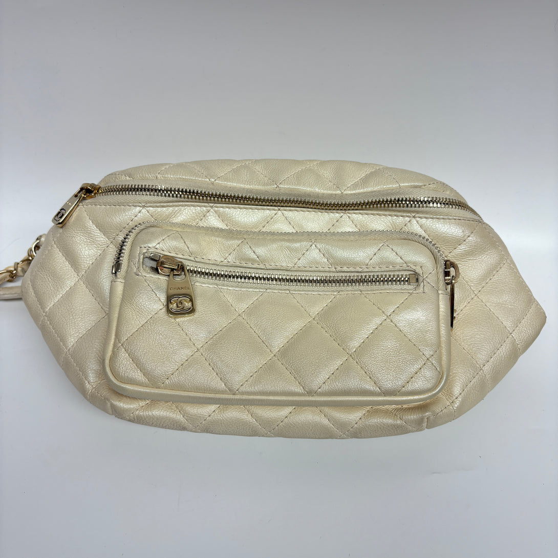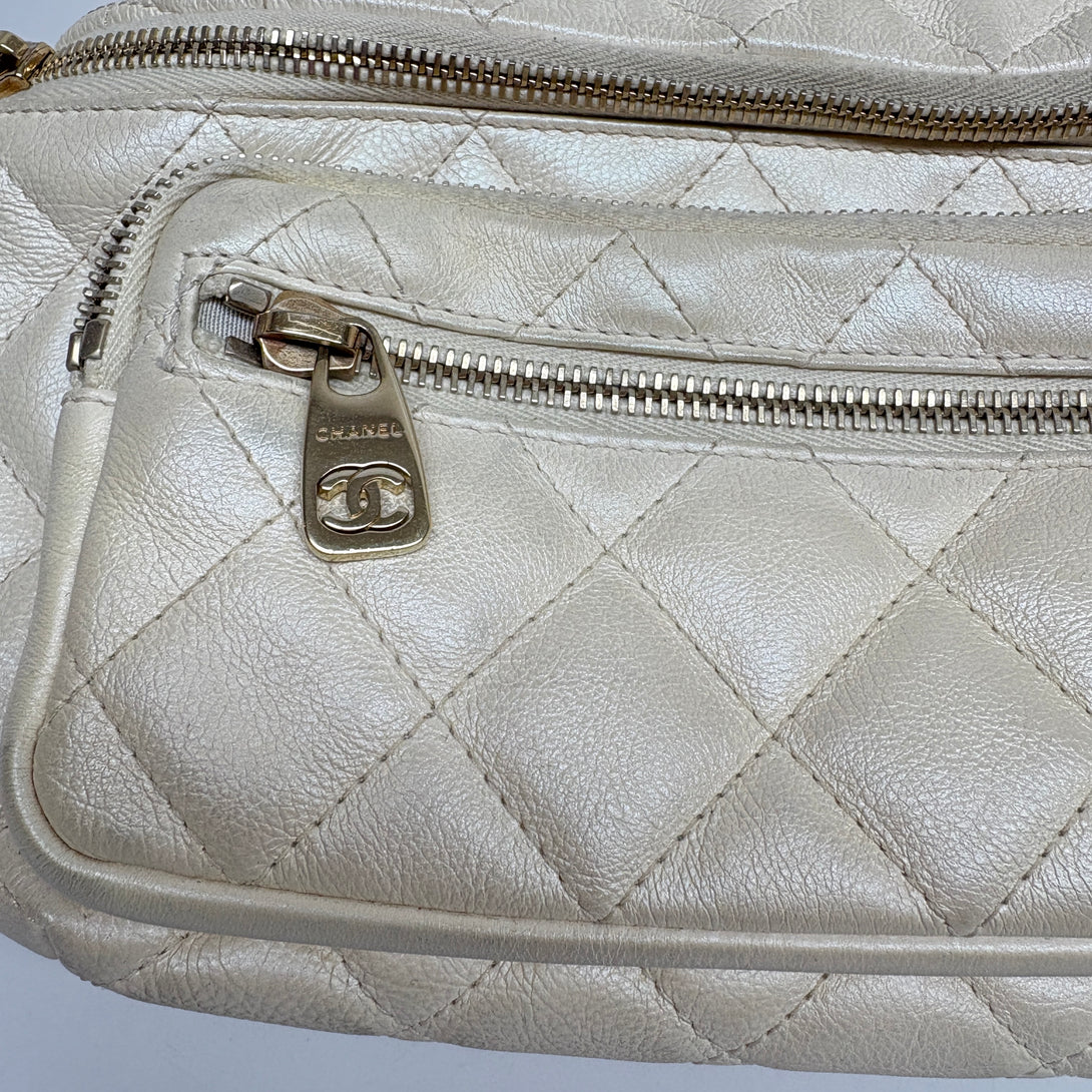 Pre-owned Chanel White Pearl Shine Calfskin Fanny Pack