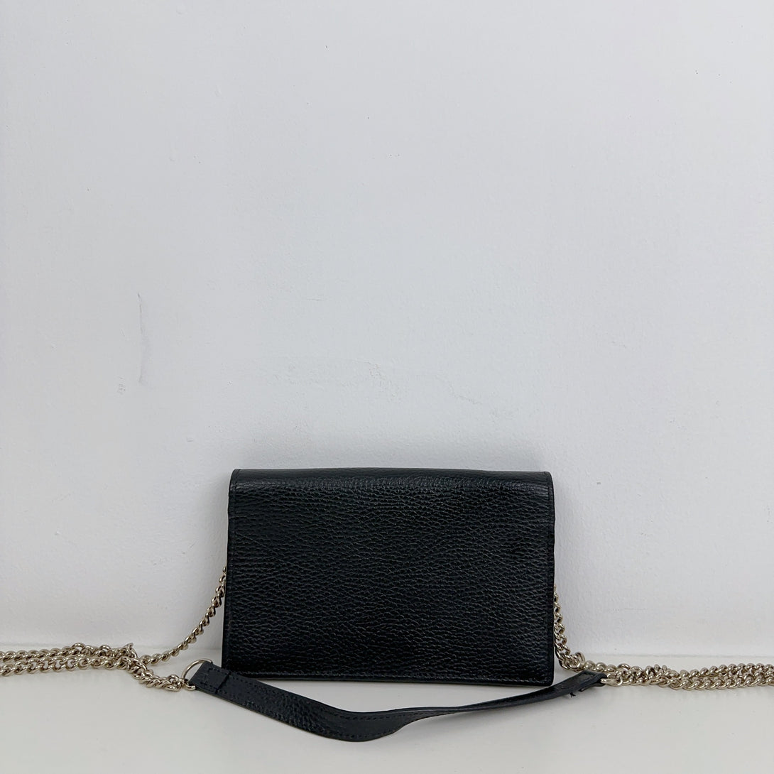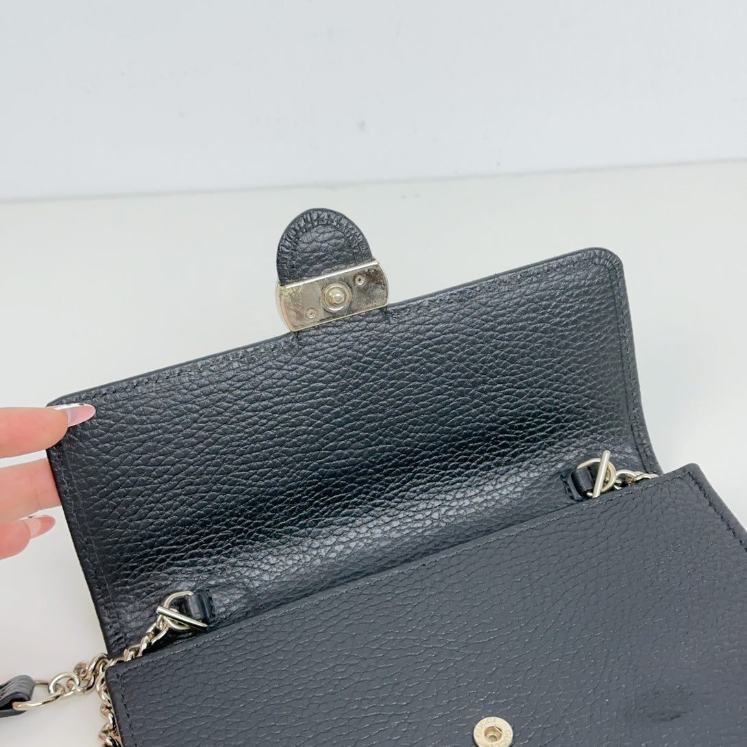 The pre-owned Gucci Interlocking GG Black Calfskin Crossbody combines timeless luxury with everyday functionality. Crafted from premium black calfskin leather, this bag features the iconic interlocking GG logo for unmistakable brand recognition. Its compact design and adjustable strap offer versatile wear, making it an ideal accessory for both casual and formal occasions. Expertly constructed, this crossbody ensures durability while adding a sophisticated touch to your wardrobe.