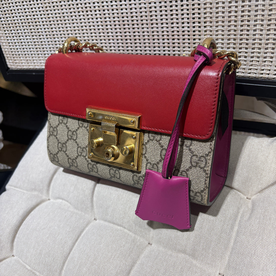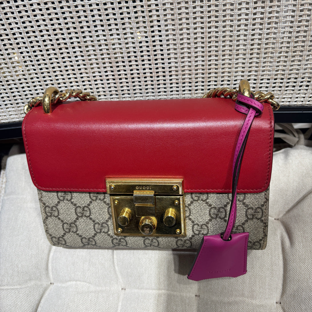 Elevate your accessory collection with this pre-owned Gucci Padlock crossbody, a coveted piece that seamlessly blends luxury with practicality. Crafted from rich red calfskin paired with iconic GG canvas, this bag showcases Gucci's signature aesthetic and exceptional craftsmanship. The distinctive padlock closure adds both security and sophisticated style, while the adjustable crossbody strap ensures comfortable, hands-free wear. Perfect for those who appreciate authentic designer pieces with character and heritage, this crossbody transitions effortlessly from day to evening occasions.