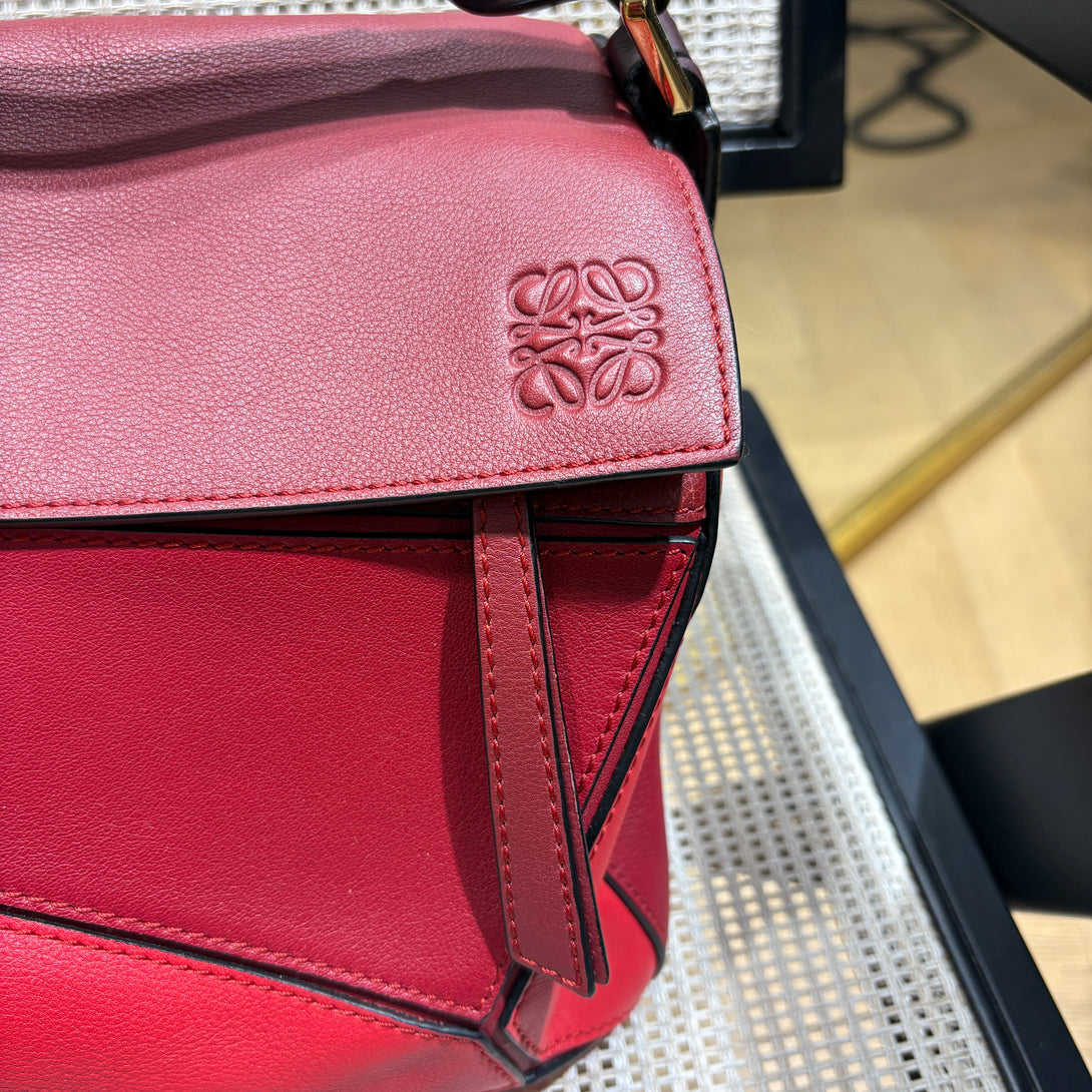 Crafted from luxurious red calfskin, this pre-owned Loewe Puzzle crossbody combines innovative design with expert craftsmanship. Its distinct geometric panels offer a versatile silhouette that can be carried multiple ways, delivering both style and functionality. Perfect for daily use, the adjustable strap ensures comfortable wear, while the high-quality leather guarantees durability. An impeccable choice for those who appreciate refined elegance and a modern edge.