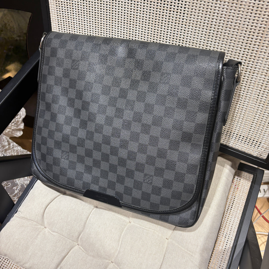 Elevate your collection with this pre-owned Louis Vuitton District crossbody in iconic Damier Graphite canvas. This sophisticated piece combines the house's signature monogram pattern with refined craftsmanship, featuring a structured silhouette and adjustable shoulder strap for versatile styling. The spacious interior accommodates daily essentials, while multiple pockets ensure organised storage. A timeless investment piece that seamlessly transitions from professional settings to casual outings, this crossbody exemplifies Louis Vuitton's enduring design heritage and exceptional quality.